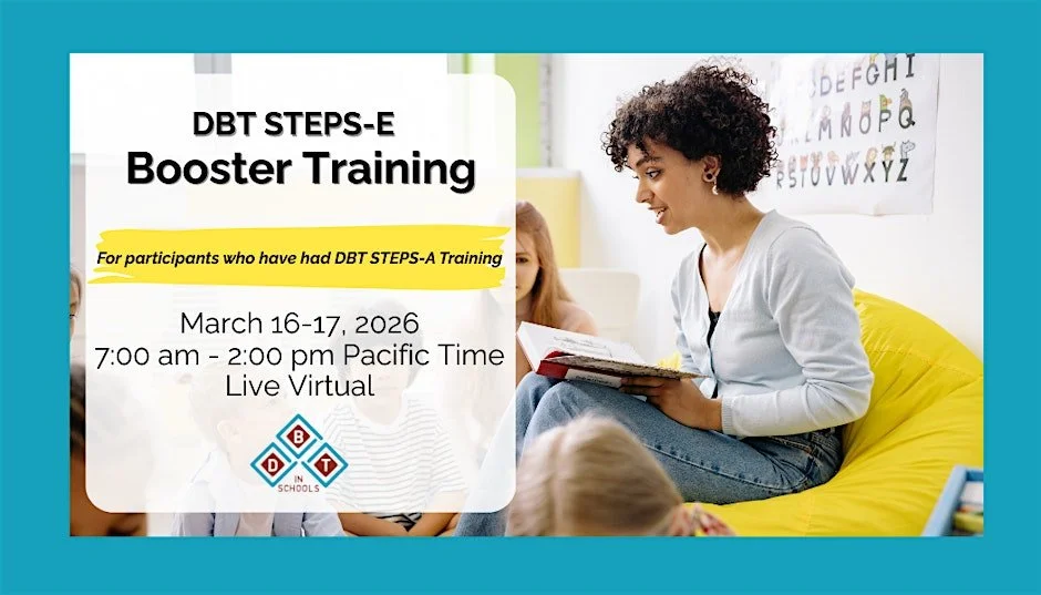 PLEASE NOTE: This training is ONLY for past DBT STEPS-A trainees. You will be asked during registration for the dates when you attended DBT STEPS-A Implementation Training. If you have not attended DBT STEPS-A training in the past, then you may be unenrolled and your payment refunded (less Eventbrite fees). If you are new to DBT in Schools, please CLICK HERE to register for the 3-Day DBT STEPS-E Implementation Training.
